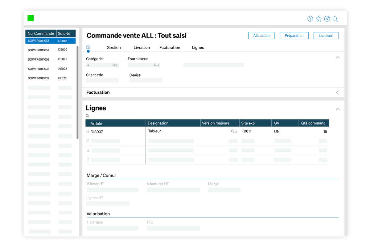 Sage X3 vous permet d'offrir un service exceptionnel à vos clients. L'intégration complète des ventes, de la gestion du stock, des achats, des aspects financiers et de la production vous permet d'appréhender pleinement l'activité de vos clients, le tout au sein d'une seule et même solution de gestion commerciale